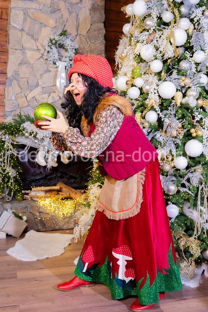 Подруга Санта Клауса облачена в красное слегка приталенное платье с меховым низом. Дополняет картину золотой поясок с белыми помпонами, жилетка из белого меха и праздничный колпачок. |