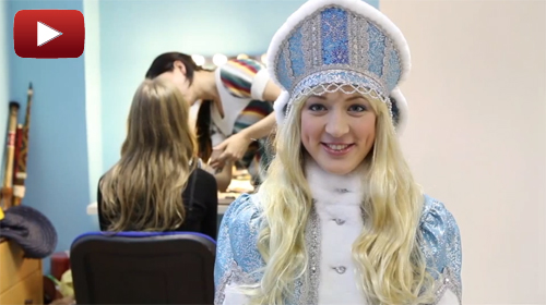Костюм Снегурочки - копия одеяний XV века. Об этом говорит длинная рубаха в традиционных белых и красных цветах, которая отделяется золотистой тесьмой от расписной синей ткани. Поверх рубахи - накидка, окантованная белым мехом, а её рукава украшены мехом, золотой и красной тесьмой. Необычна и треугольной формы шапочка, обрамлённая мехом и кружевом.