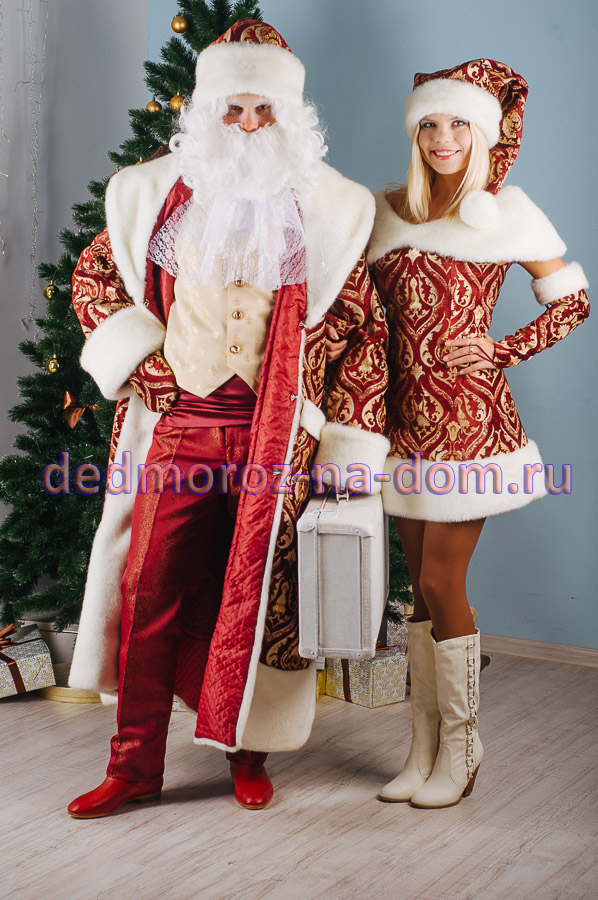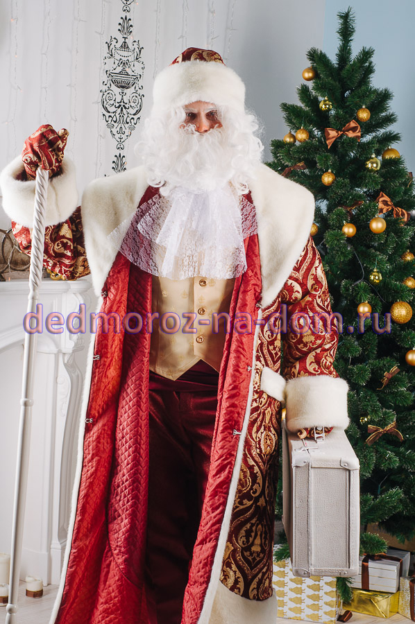 «Аристократичный» Дед Мороз отлично подойдёт для проведения корпоратива и поздравления сотрудников в офисе. Дед Мороз облачён в красивую бордовую шубу с меховым воротником и манжетами. Шуба разрисована золотыми орнаментами, что придаёт ей колоритность. Под шубой находятся бордовые брюки, белое жабо и бежевая жилетка. Кроме этого, у Деда Мороза есть неизменная борода, шапка, отстроченная мехом и туфли.