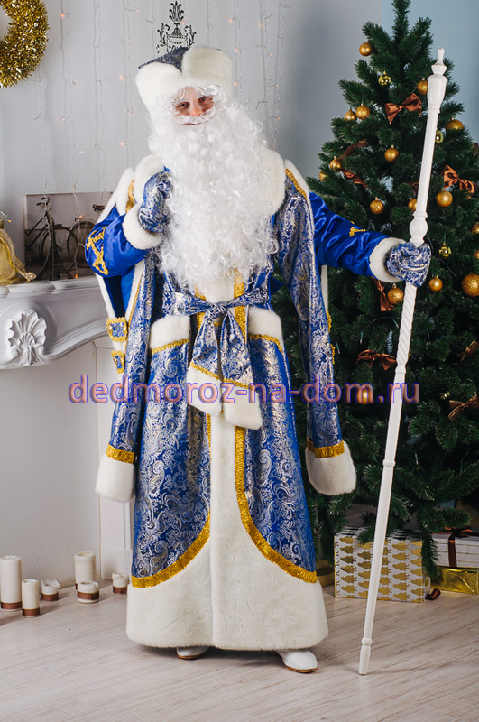 Костюм Деда Мороза является точно таким же, как и костюм «Боярский красно-золотой», только выполнен в синем цвете. Шуба сделана из синего материала и украшена золотыми узорами, золотой тесьмой и белым мехом. Длинная белая рубашка подпоясывается синим атласным поясом с золотыми кисточками.