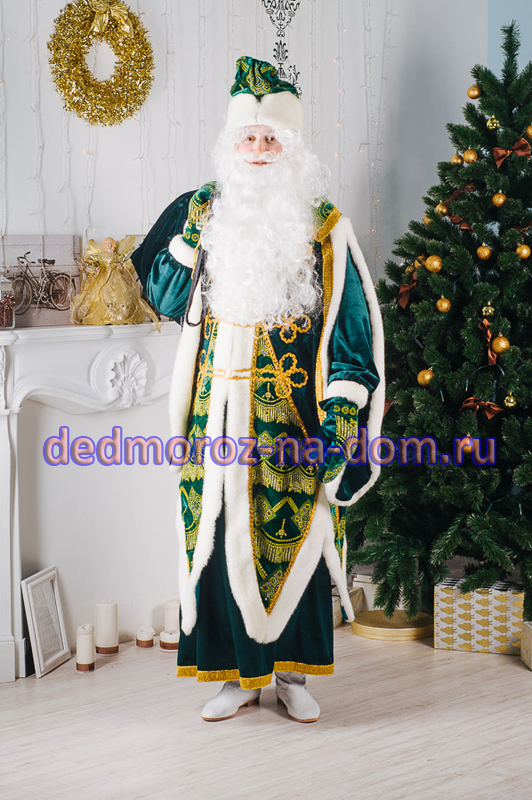 Костюм состоит из двух частей. Первая часть – это шуба. Шуба сделана из красного материала с золотыми узорами. Края рукавов и нашивки на груди выполнены из сверкающей широкой золотой тесьмы. Все края шубы отстрочены белым мехом, меховым является и большой воротник. Под шубой у Деда Мороза находится длинная белая рубашка, которая подпоясывается атласным красным поясом с золотыми кисточками. Этот костюм есть и в синем варианте.
