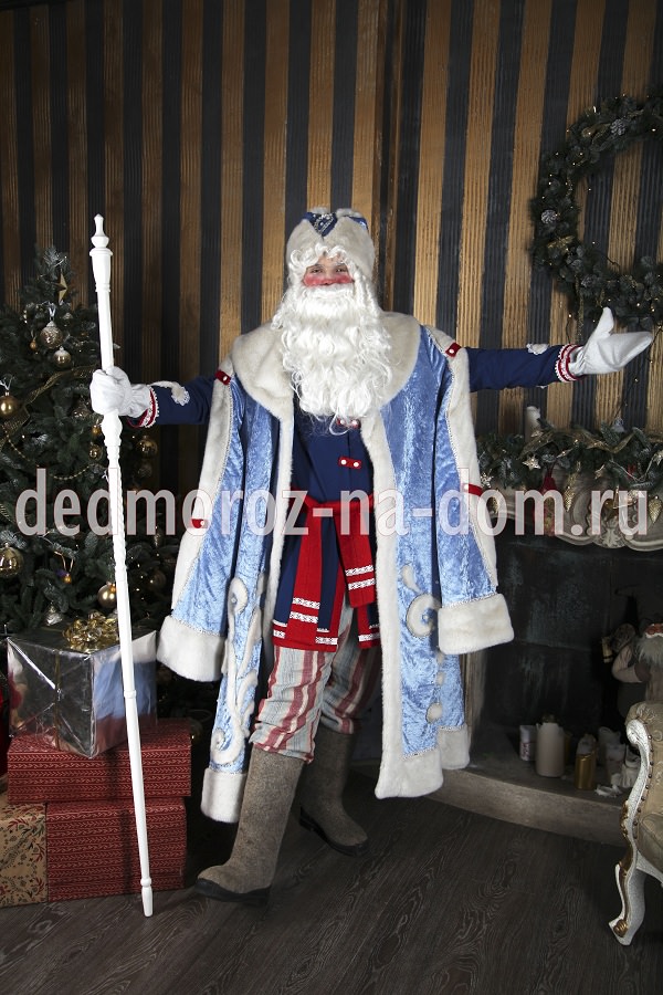 Синяя шуба Деда Мороза обрамлена широкими полосами короткого белого меха, из него же сделаны манжеты, воротник и край шапки. Сама шуба расшита серебристой тесьмой, из более тонкой тесьмы вышиты снежинки, которые придают особый колорит костюму. Под шубой у Деда Мороза надета длинная белая рубаха. Рукава рубахи украшены серебристыми манжетами и продеваются через прорези в шубе. Рубаха подпоясывается широким атласным синим поясом с серебристыми кисточками.