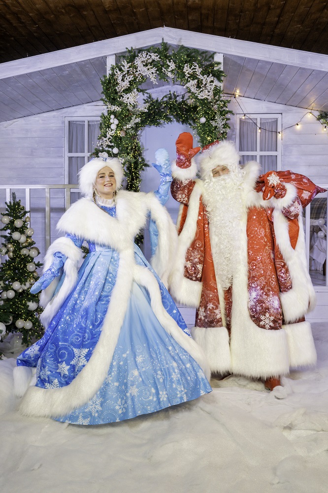 Костюм Деда Мороза состоит из двух частей. Шуба сделана из голубого материала, отстрочена белым мехом, украшена искусными узорами и вышивкой. Нижняя рубашка насыщенного синего цвета имеет декоративные красные застёжки и подпоясывается ярким красным поясом с белыми полосками. Интересно отделаны рукава: их украшают жемчужины, белые кружевные элементы и бело-красные манжеты. Довершают образ белые варежки, валенки, синяя шапка, отделанная белым мехом, посох и голубой мешок для подарков.