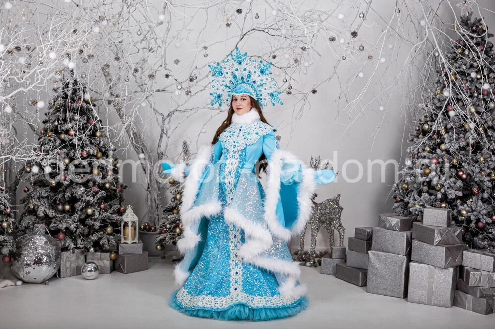 Восхитительный костюм Снегурочки поразит воображение любого человека. Длинная серебристая рубаха украшена белыми кружевами, поверх надевается серебристая накидка, отстроченная коротким белым мехом и кружевом. На голову же надевается невероятной красоты кокошник с вышивкой, мехом и кружевом, который дополнен невесомой полупрозрачной фатой, что придаёт образу сказочности.