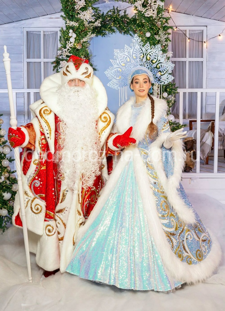 «Царская сине-золотая» Снегурочка отлично гармонирует с Дедом Морозом в «Царском синем» костюме. Этот же костюм есть и в красном варианте. Костюм сделан из синей ткани и украшен узорами серебряного цвета. |