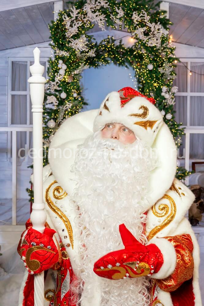 Дед Мороз облачен в нарядную ярко-красную шубу, которая расписана блестящими серебристыми узорами. Шуба подпоясана широким красно-серебристым поясом, который украшен на концах мехом. Широкая полоса белого меха также украшает низ шубы, ее пелерину, манжеты и край красно-серебристой шапки. На ногах Деда Мороза красуются красные сапоги, а на руках – красно-серебристые варежки. В руках – красный посох.